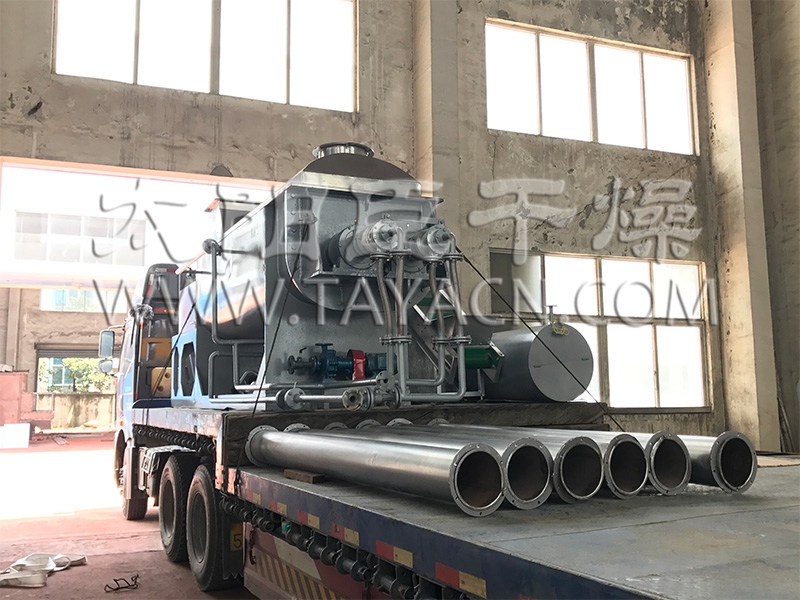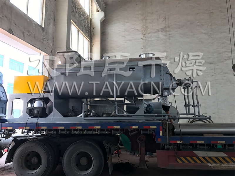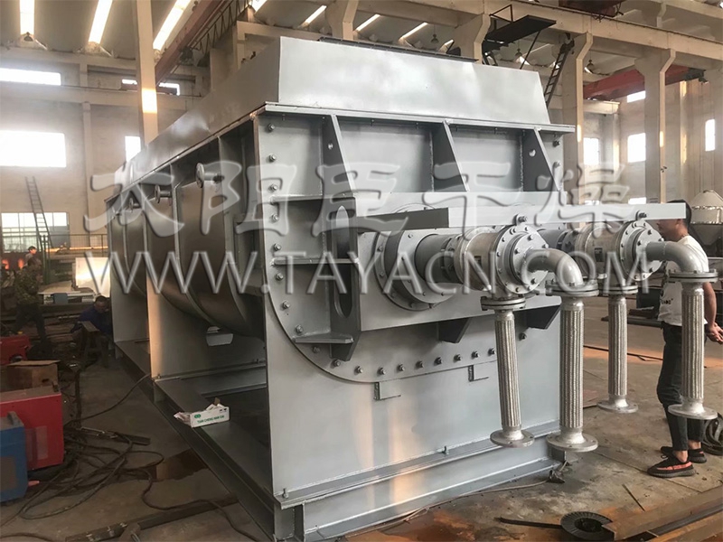 空心軸上密集排列著楔型中空漿葉,熱介質經空心軸流經漿葉。單位有效容積內傳熱面積很大,熱介質溫度從-40℃到320℃,可以是水蒸汽,也可以是液體型:如熱水、導熱油等。間接傳導加熱,沒有攜帶空氣帶走熱量,熱量均用來加熱物料。熱量損失僅為通過器體保溫層向環境的散熱。楔型漿葉傳熱面具有自清潔功能。物料顆粒與楔型面的相對運動產生洗刷作用,能夠洗刷掉楔型面上附著物料,使運轉中一直保持著清潔的傳熱面。漿葉干燥機的殼體為Ω型,殼體內一般安排二到四根空心攪拌軸。殼體有密封端蓋與上蓋,防止物料粉塵外泄而充分發揮作用。